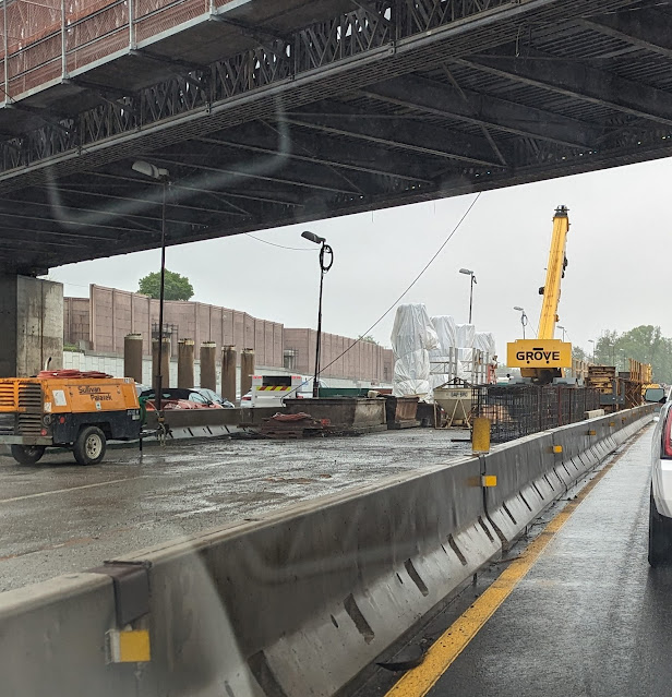 Work continues on the first new set of center supports for the new Browning Road overpass. In this picture you can see the rebar where the fountains for the supports have been constructed. The supports in the background will eventually be removed and new ones constructed.